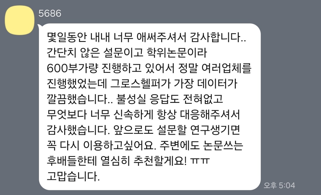 안녕하세요, 설문/인터뷰/좌담회 서비스 제공하는 그로스헬퍼입니다.지난달 9월부터 많은 석사 박사 분들이학위논문을 위한 설문조사 데이터 수집을 위해저희 서비스를 많이 이용하고 계신데요,필요한 분들이 더 계실 것 같아이렇게 글을 쓰게 되었습니다.
